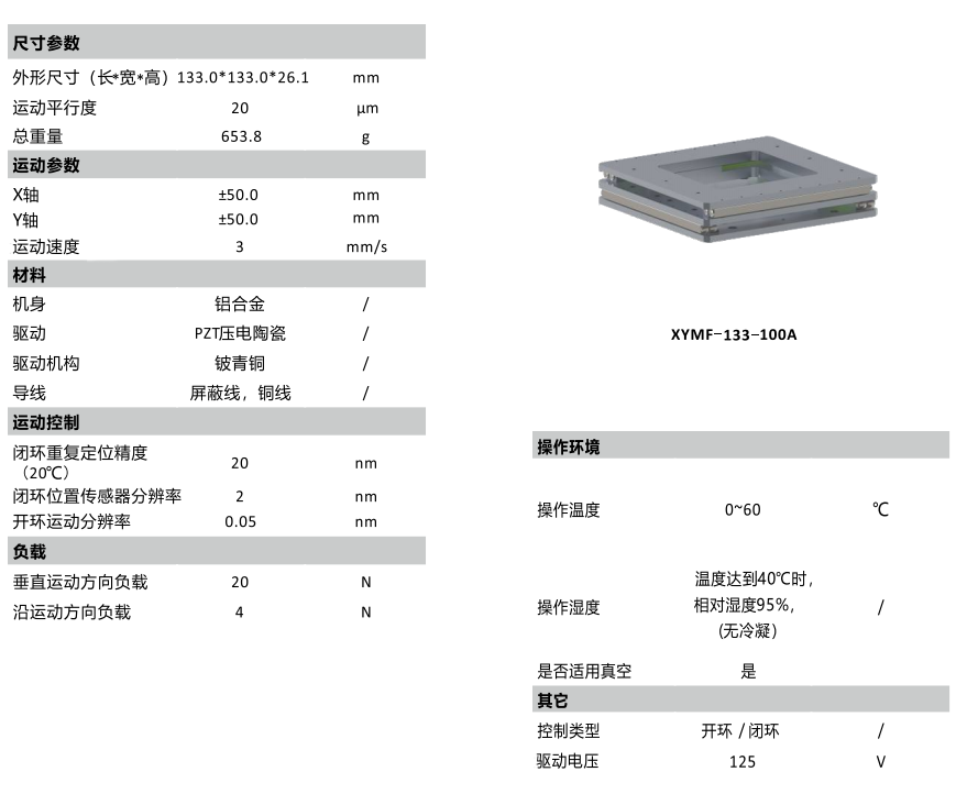 壓電二維納米位移臺使用壓電陶瓷驅(qū)動,運(yùn)動無需潤滑,并可在很廣的溫度范圍內(nèi)工作。運(yùn)動分辨率達(dá)到亞納米級。步進(jìn)和掃描雙模式工作,并且在宏觀行程范圍內(nèi)同樣達(dá)到亞納米分辨率的定位。支持開環(huán)閉環(huán)控制。